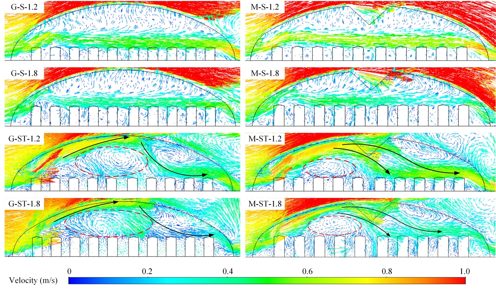 图1. 普通大跨度拱棚与M型农业大棚气流分布对比