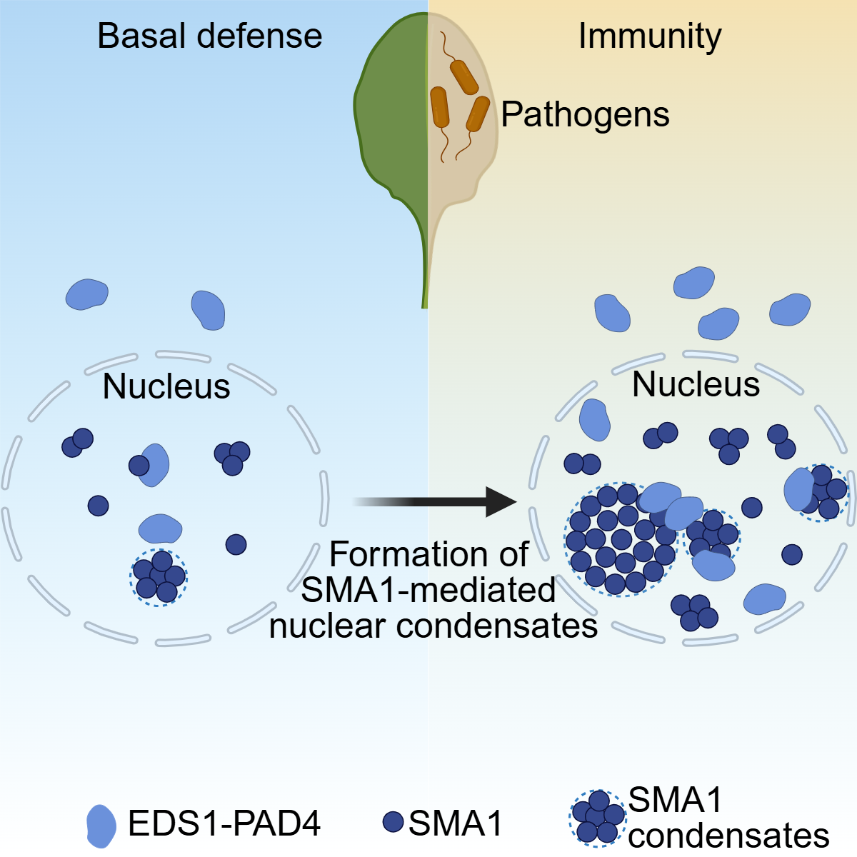 该研究首次揭示了SMA1通过液-液相分离机制与EDS1形成核内凝聚体以激活植物免疫的分子途径,为深入理解植物如何精准调控免疫应答开辟了新视角。SMA1作为一种同时参与RNA代谢、生长发育和免疫反应调控的多功能蛋白,其作用机制的深入解析对于平衡作物抗病性与生长发育、优化作物设计具有重要的理论和应用价值。